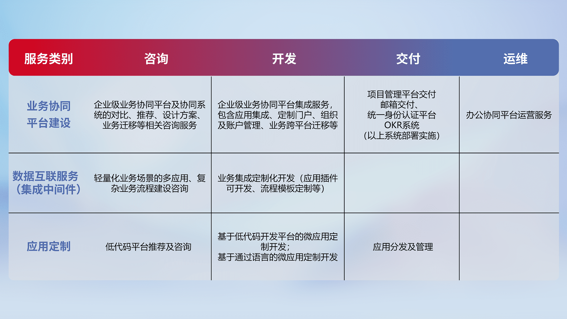 针对钉钉、、、企微、、、IDaas等平台级产品提供产品的规划、、、方案、、、交付、、定制化开发等服务,,,,实现如统一协同办公、、智能客户服务、、、混合会议管理、、、、智能数据查询、、、、等业务场景,,,,实现数字化转型。。。